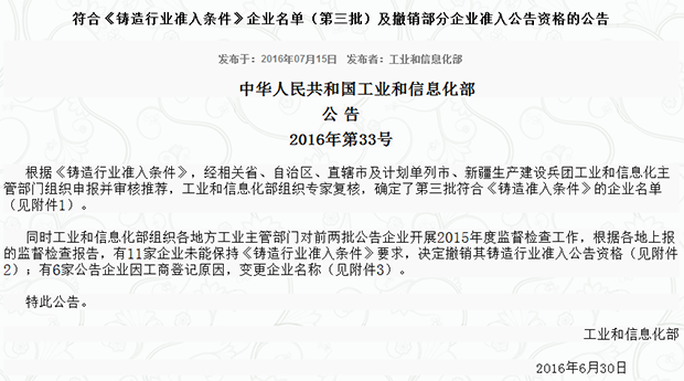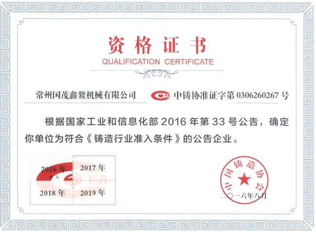 2016年7月15日,国家工信部发布2016年第33号公告,向社会公示了2015年度第三批626家“符合《铸造行业准入条件》的企业名单”,该名单经相关省、自治区、直辖市及计划单列市、新疆生产建设兵团工业和信息化主管部门组织申报并审核推荐,工业和信息化部组织专家复核,公示后确定。常州国茂鑫鳌机械有限公司位列名单之中!